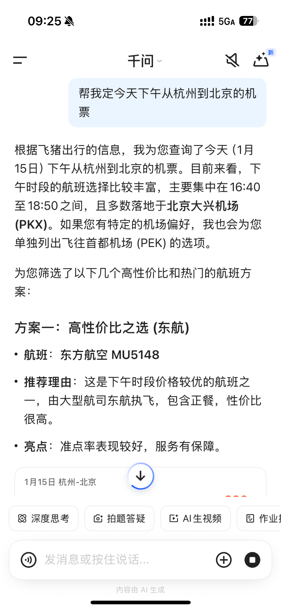 1月15日上午9时许,21世纪经济报道记者留意到最新版千问APP已支持AI点外卖、订机票、定酒店等落地功能。