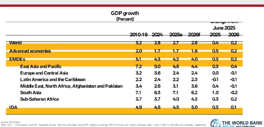 近日,世界银行在最新一期《全球经济展望》报告中指出,尽管贸易紧张局势与政策不确定性持续存在,全球经济的韧性仍超出预期。预计未来两年全球增速大体保持平稳,2026年降至2.6%, 2027年回升至2.7%,较去年6月的预测有所上调。