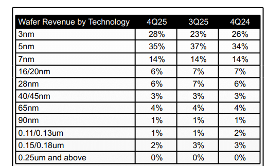 具体来说,3纳米工艺技术在第四季度的晶圆营收中占比28%,而5纳米和7纳米分别占35%和14%。