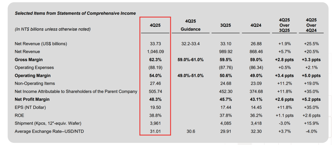 净利润:5057.4亿新台币(约合人民币1116.16亿元),同比增长35.0%,环比增长11.8%;预期为4783.7亿新台币(约合人民币1055.76亿元)