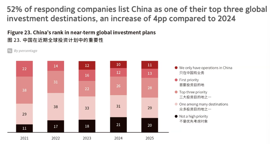中国仍是美资企业不可或缺的关键市场。出于对中国市场的重视和对增长的预期,52%的受访企业仍将中国视为全球前三大投资目的地,较上一年度提升4个百分点。