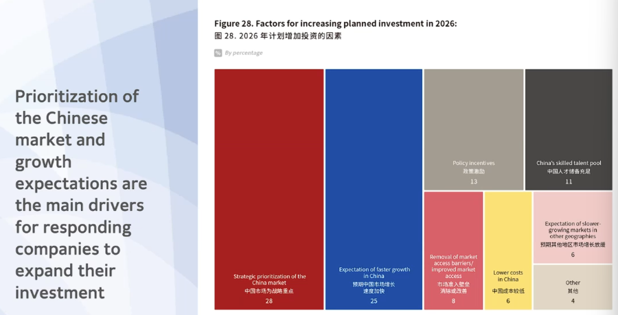 另外,57%的受访企业计划未来加大在华投资。看重中国市场战略地位(28%)和发展潜力(25%)则是受访企业追加投资主要动因。七成企业认为在华受欢迎程度与上一年度持平或有所上升,较上一年度增长2个百分点。