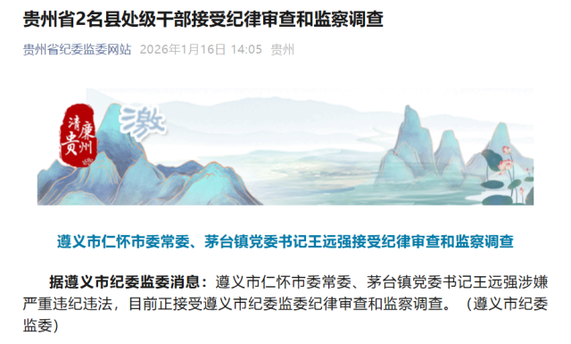 1月16日,据贵州省纪委监委网站:遵义市仁怀市委常委、茅台镇党委书记王远强涉嫌严重违纪违法,目前正接受遵义市纪委监委纪律审查和监察调查。