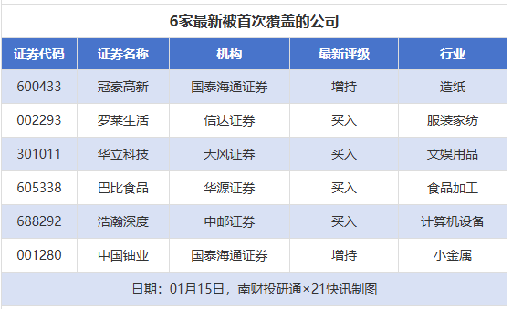 首次覆盖方面,1月15日券商共给出了6次首次覆盖,其中冠豪高新获得国泰海通证券给予“增持”评级,罗莱生活获得信达证券给予“买入”评级,华立科技获得天风证券给予“买入”评级,巴比食品获得华源证券给予“买入”评级,浩瀚深度获得中邮证券给予“买入”评级。
