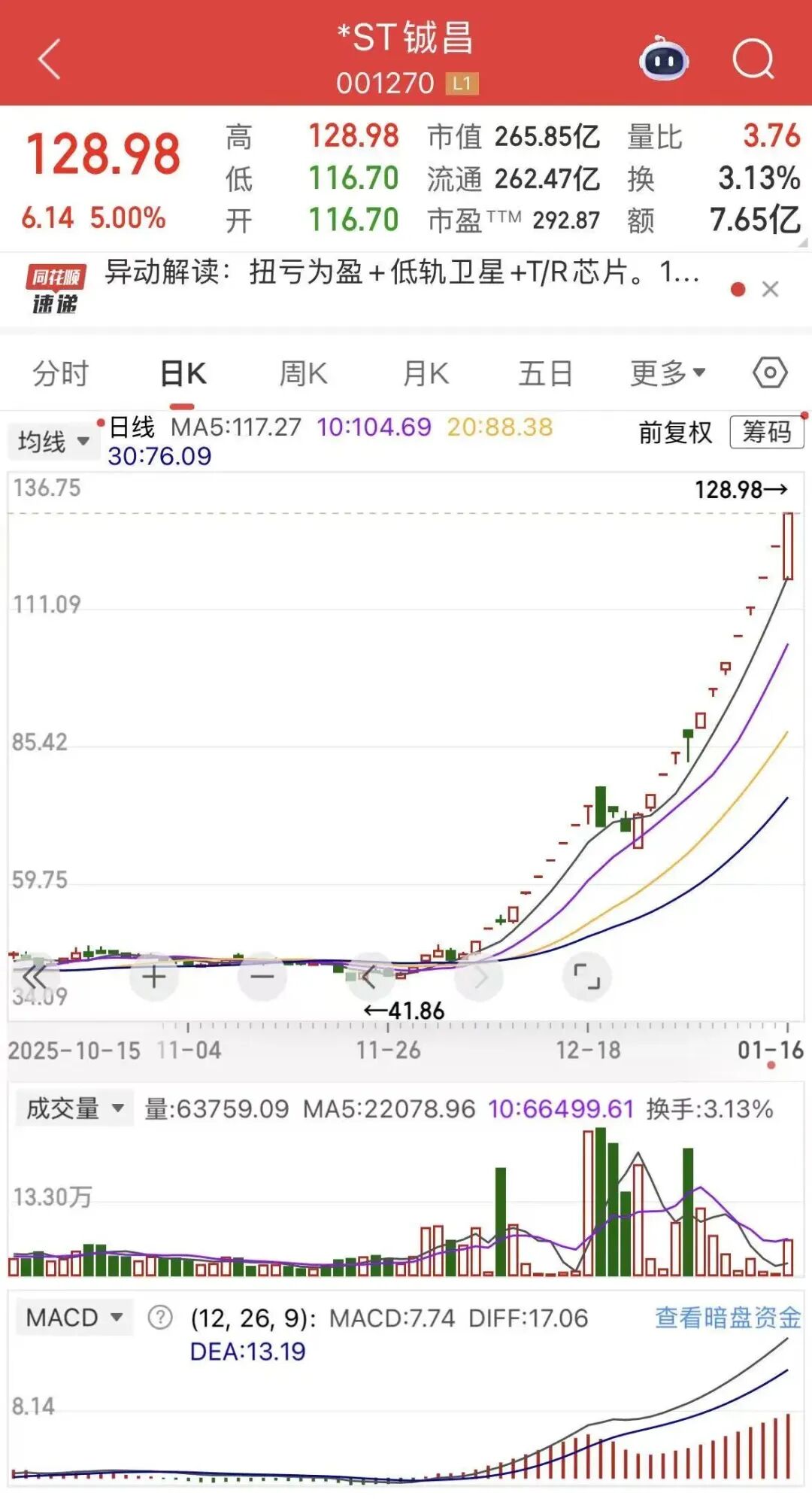 行情数据显示,*ST铖昌今日(1月16日)开盘跌停,随后1分钟内强势拉升涨停,走出“地天板”走势,股价报128.98元/股。值得一提的是,该股近12个交易日已收获11个涨停板。