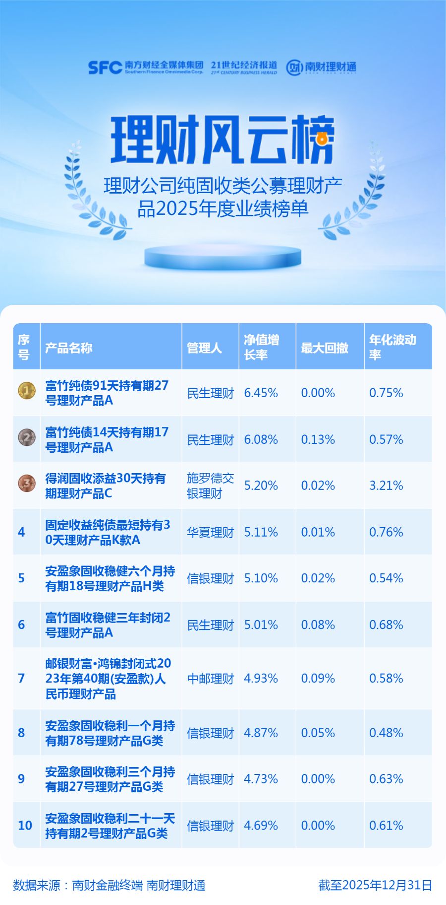 值得注意的是,本期榜单中有3只产品实现2025年全年“0回撤”,其中一只是冠军产品民生理财“富竹纯债91天持有期27号理财产品A”,另外两只是来自信银理财的“安盈象固收稳利三个月持有期27号理财产品G类”和“安盈象固收稳利二十一天持有期2号理财产品G类”。