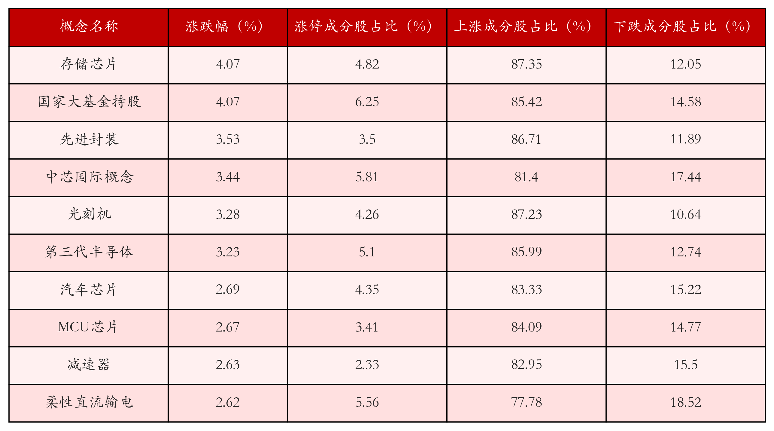 根据A股概念涨跌幅与所对应的股票池综合分析,涨幅靠前的三个概念板块分别为:存储芯片、国家大基金持股与先进封装。排名前10位的概念板块相关数据见下表: