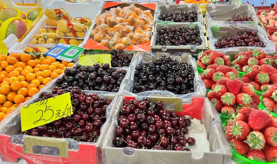 社区农贸市场摊位上的车厘子(21世纪经济报道记者摄)