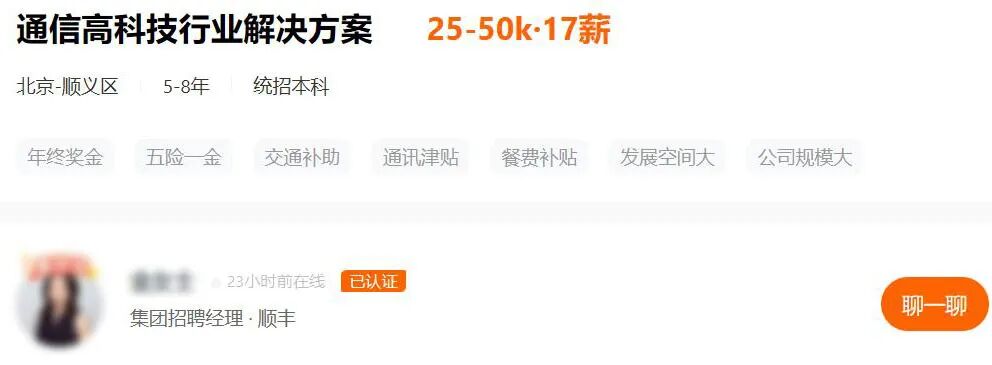 招聘网站显示,为招募“通信高科技行业解决方案”销售人员,顺丰最高开出5万月薪,并标明一年发放17个月薪酬。