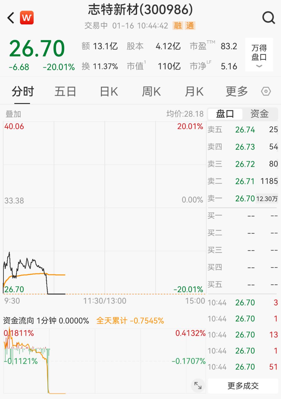 1月16日,大牛股志特新材(300986.SZ)20cm跌停,截至10:44,报26.70元/股,总市值为110亿元。此前,该股接连斩获20cm“六连板”,涨幅达198.57%,是年内首只翻倍股,也是今年以来涨幅最大的股票。因涨幅过大,1月13日开市起,志特新材停牌核查。