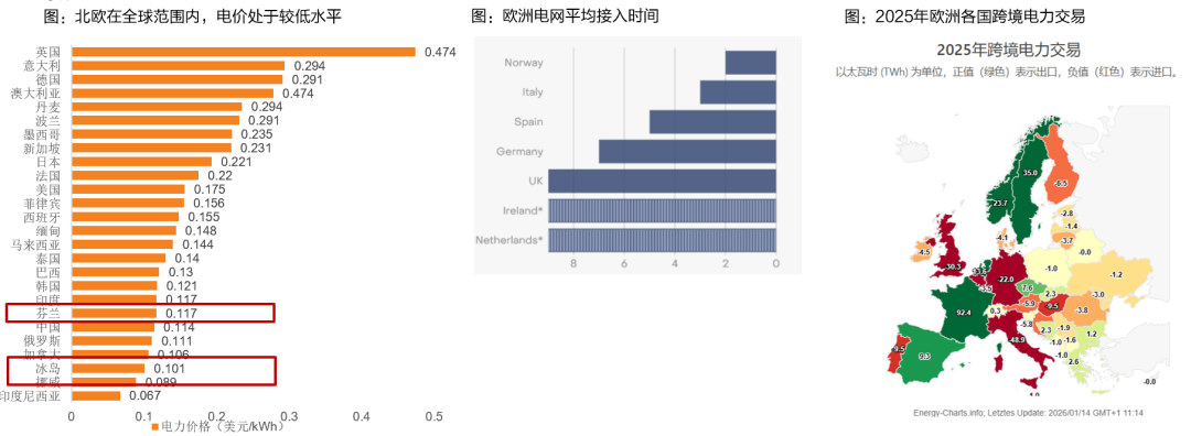 为什么选择北欧?全球电价洼地+电网拥堵程度低+电力充裕。传统数据中心FLAD-P电网拥堵以及电力成本高昂,英国、爱尔兰、荷兰电网接入时间在8年以上,而挪威仅2年;电价在欧洲乃至全球处于较低水平,绝对的电价洼地;北欧的挪威和瑞典是欧洲主要的电力出口国,电力充裕。另外北欧电力系统可再生能源占比高,碳强度低;同时气候寒冷,显著减少了冷却的能源消耗。