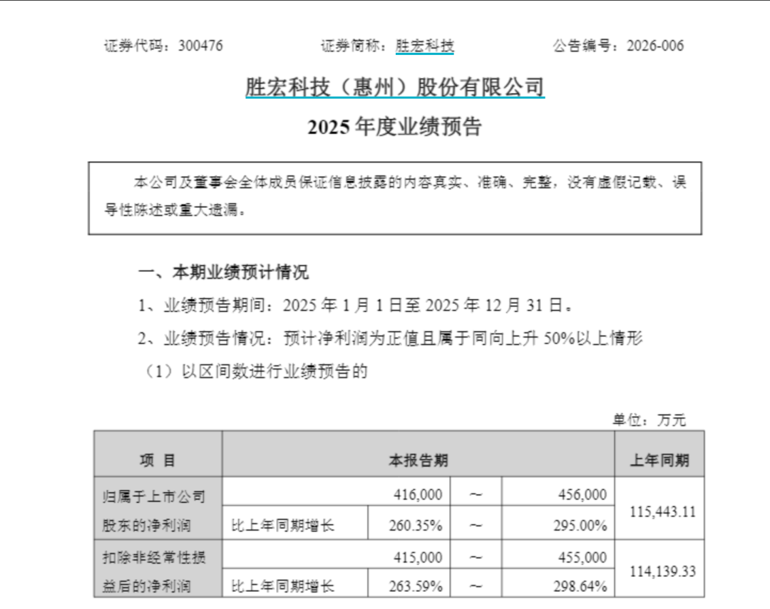 PCB龙头胜宏科技2026年1月16日晚间发布业绩预报称, 2025年预计净利润约41.6亿元—45.6亿元,同比增长260.35%—295.0%。
