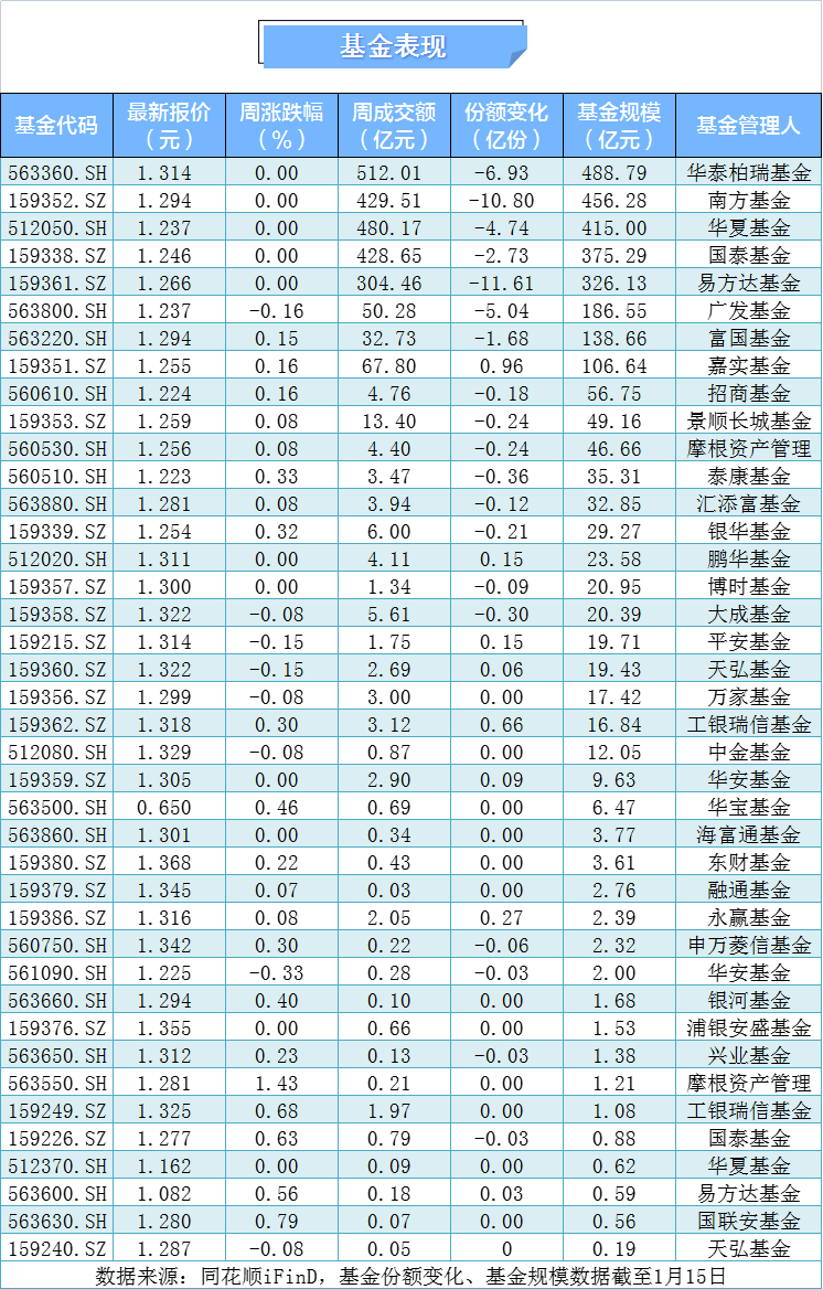 本周40只中证A500基金涨多跌少,其中摩根资产的A500增强摩根领涨,涨幅达1.43%;华安基金的中证A500增强ETF领跌,跌幅为0.33%。截至1月15日,基金总规模逼近3000亿元,达2936.40亿元,规模前三为A500ETF华泰柏瑞、A500ETF南方、华夏基金的中证A500ETF,分别为488.79亿元、456.28亿元、415亿元。