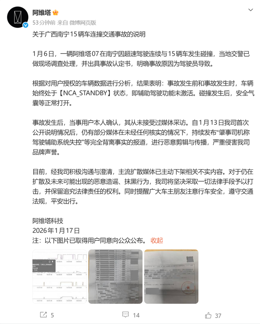事故发生后,当事用户本人确认,其从未接受过媒体采访。自1月13日阿维塔首次公开说明情况后,仍有部分媒体在未经任何核实的情况下,持续发布“肇事司机称驾驶辅助系统失控”等完全背离事实的报道,进行恶意剪辑与传播,严重侵害阿维塔品牌声誉。