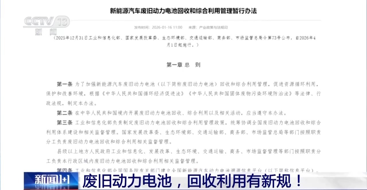 2025年新能源汽车的产销双双突破了1600万,同时新能源汽车废旧动力电池综合利用量超过了40万吨,五年后这个总量可能会超过100万吨。目前最早一批新能源汽车搭载的动力电池逐步进入到规模化“退役”阶段,我们的废旧动力电池回收和利用体系准备好了吗?1月16日,工信部联合6部门发布了《关于新能源汽车废旧电池回收和综合利用的管理办法》,它直击当下该行业的哪些痛点,会给我们回收利用的产业和企业带来怎样的影响。