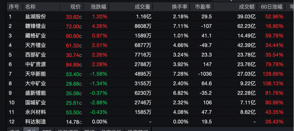 截至1月15日A股收盘,锂矿概念股盐湖股份(000792.SZ)、赣锋锂业(002460.SZ)、藏格矿业(000408.SZ)、天齐锂业(0002466.SZ)、西部矿业(601168.SH)、中矿资源(002738.SZ)60日涨幅,分别达到了52.96%、16.90%、59.79%、34.44%、35.54%和79.78%。