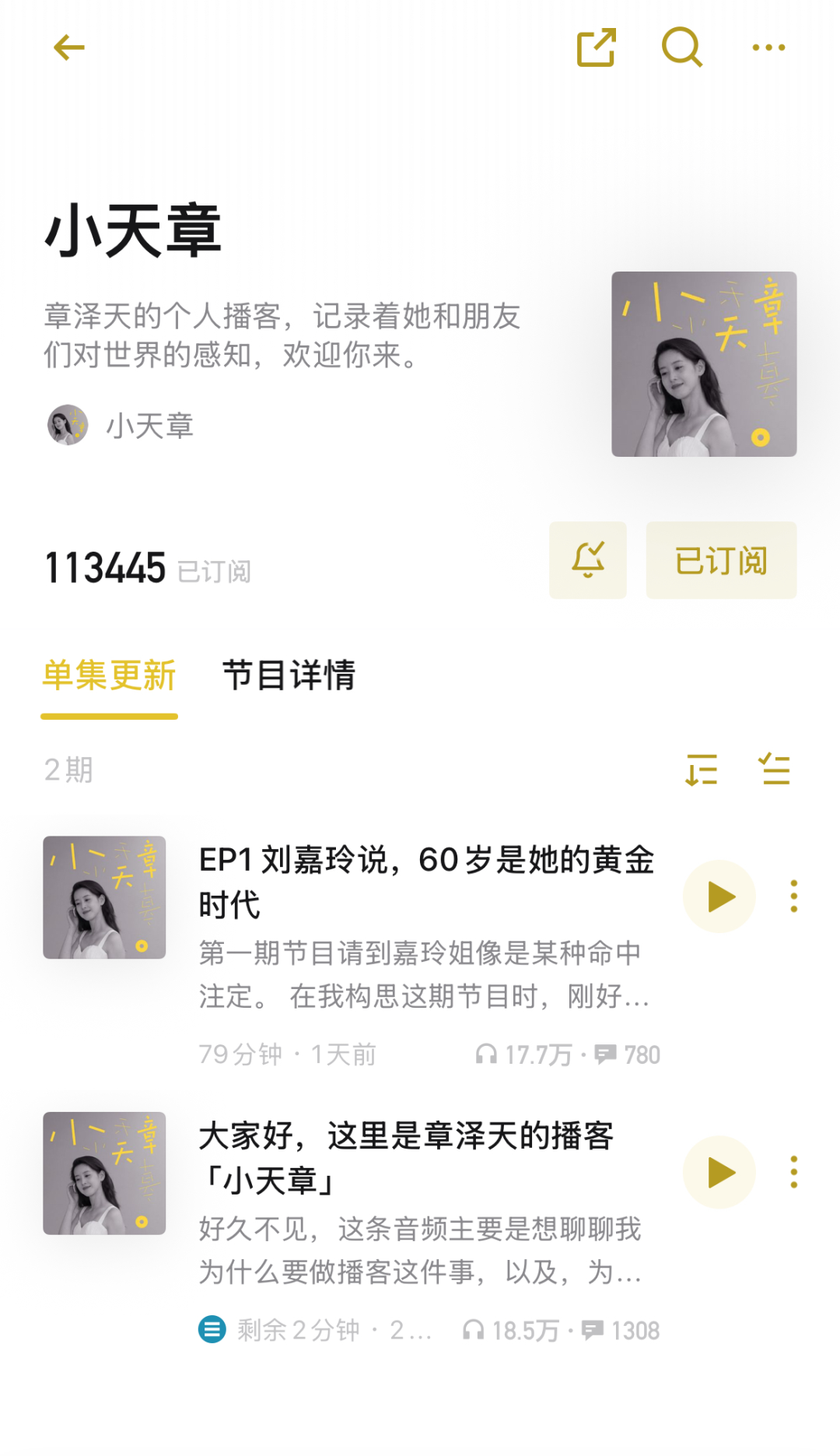 1月12日,章泽天正式上线个人播客节目《小天章》,同步登陆小宇宙与苹果播客平台。节目以简短自我介绍开场,上线后迅速获得关注,上线1小时收听破万,48小时内小宇宙订阅数突破11万,成为近期播客圈内最受关注的名人新作之一。