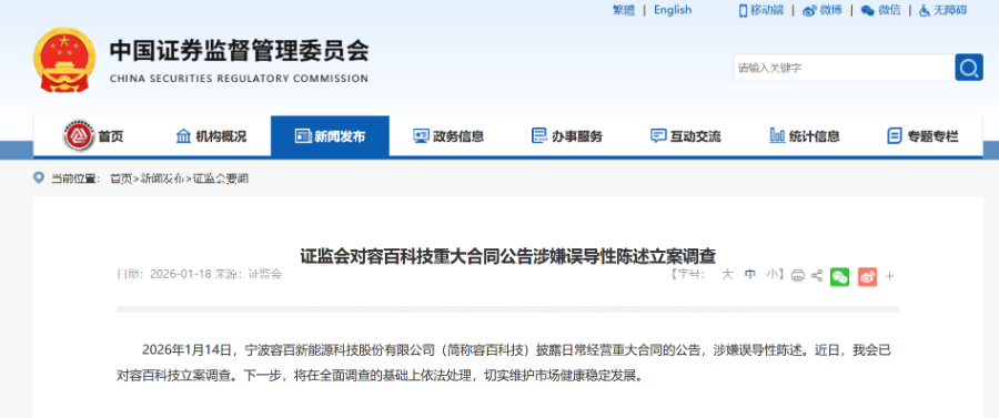 2026年1月14日,宁波容百新能源科技股份有限公司(简称容百科技)披露日常经营重大合同的公告,涉嫌误导性陈述。近日,我会已对容百科技立案调查。下一步,将在全面调查的基础上依法处理,切实维护市场健康稳定发展。