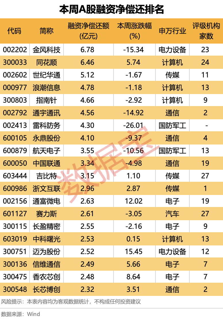 85股融资净偿还额超过1亿元。金风科技、同花顺、世纪华通排名前三,融资净偿还额依次为6.78亿元、6.46亿元、5.12亿元;浪潮信息、指南针、通宇通讯、雷科防务、永鼎股份等融资净偿还均在4亿元以上。