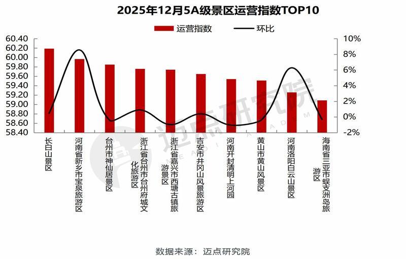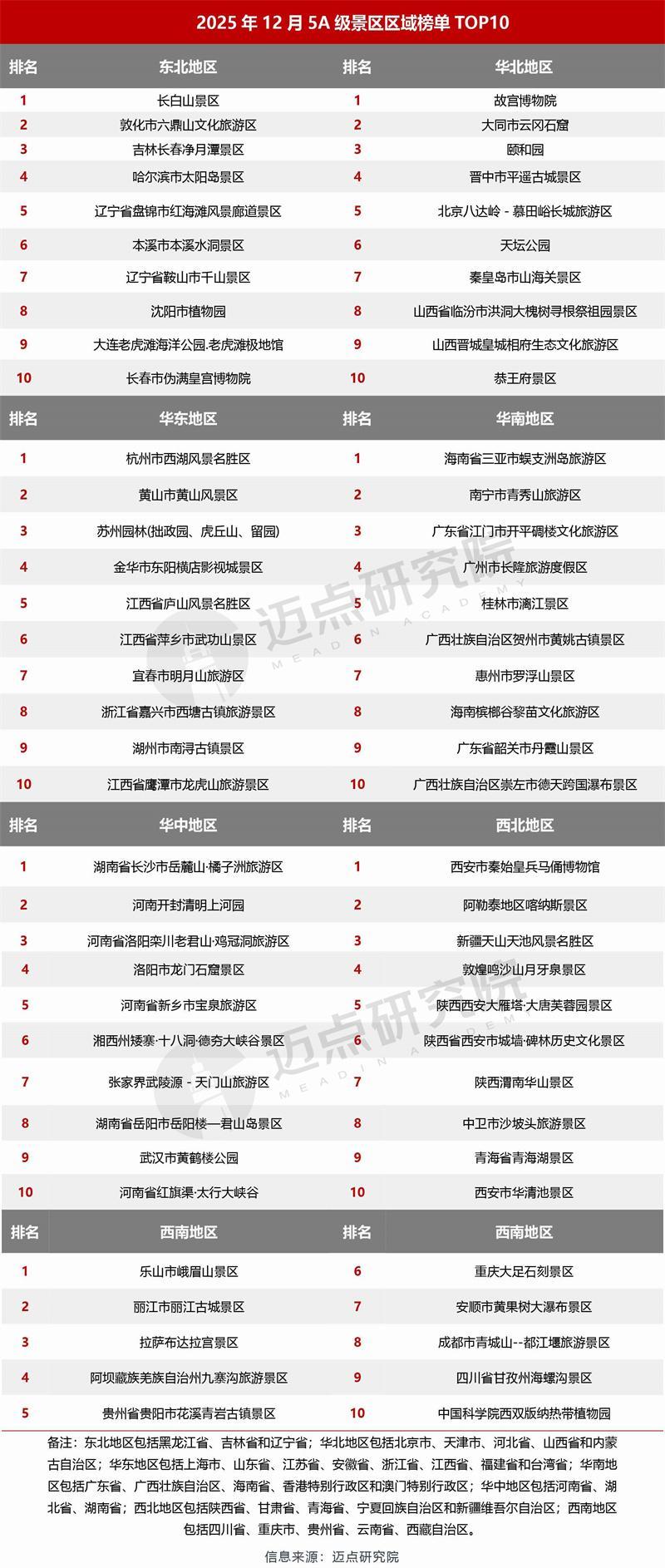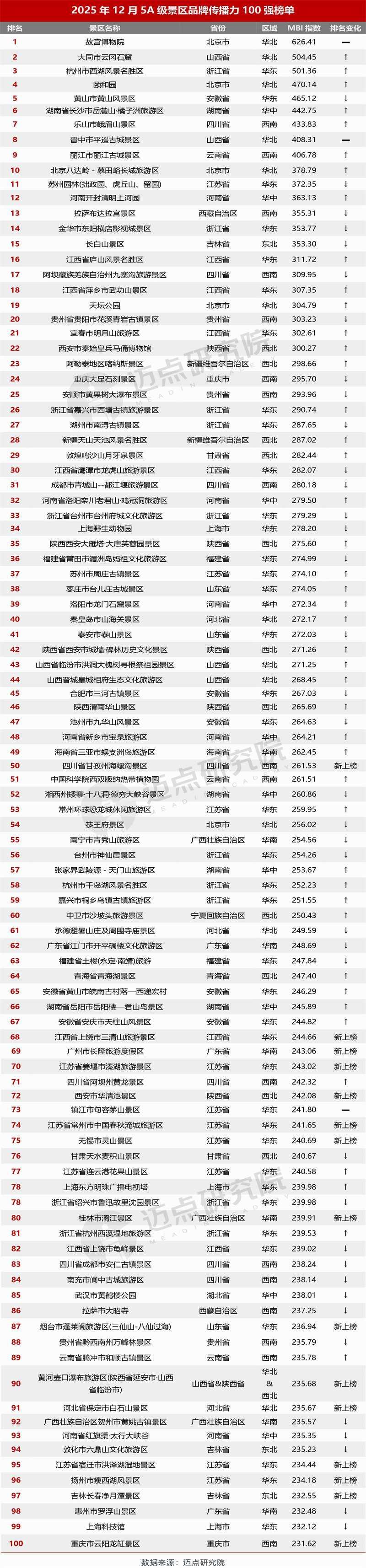 以下是迈点研究院独家发布“2025年12月5A级景区品牌传播力(MBI)100强榜单”。12月,故宫博物院、大同市云冈石窟、杭州市西湖风景名胜区、颐和园、黄山市黄山风景区、湖南省长沙市岳麓山·橘子洲旅游区、乐山市峨眉山景区、晋中市平遥古城景区、丽江市丽江古城景区、北京八达岭-慕田峪长城旅游区位列榜单前十。本月百强景区中,排名环比上升44家、下降38家、3家保持不变、15家新上榜。