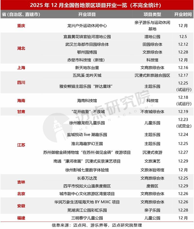 据迈点研究院不完全统计,12月新开业文旅景区项目22个,覆盖重庆、湖北、上海、四川、江苏等多省份,区域遍及东中西部各地区;项目类型丰富,涵盖运动休闲基地、湿地公园、文旅/文商旅综合体、主题乐园、沉浸式体验、科技馆等,其中文商旅综合体(如上海新天地东台里、长春万达茂、北京通州湾里)和主题乐园(如雅安“胖达星球”、淮北海趣梦幻王国)类项目较集中。这些新开业项目补充了淡季文旅供给,既能匹配本地家庭、年轻客群等不同群体的出游需求,也能依托优惠政策进一步激活淡季客流,丰富消费场景并带动文旅产业链消费。