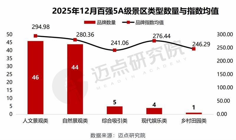 经迈点研究院监测,12月所有5A级景区的品牌指数均值为215.09,环比下降11.59%;100强5A级景区MBI品牌指数均值为284.62,环比下降约21%。12月处于传统的旅游淡季,游客出行意愿有所回落,叠加部分景区进入冬季运营调整期,品牌曝光与游客互动频次减少,使得5A级景区品牌指数呈现明显下滑,符合行业发展的周期性规律。
