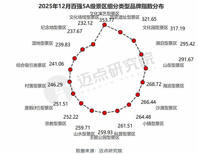2025年12月,百强5A级景区细分类型品牌指数位列前五的为文化演艺型景区、历史遗址型景区、文化园型景区、湖泊型景区、山岳型景区。其中,文化园型景区的品牌指数浮动较小,以山西省临汾市洪洞大槐树寻根祭祖园景区为例,12月景区结合游客体验推出了冬季演出节目表,以沉浸式、场景化方式让游客体验移民文化;开展“冬日暖饮,情系槐裔”主题活动,提升游客祭祖归属感等,品牌传播力提升明显,本月排名上升20位次。