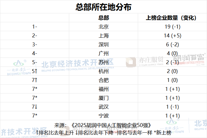 从总部所在地分布来看,北京以19家上榜企业领先,其中包括寒武纪、月之暗面和云知声等知名企业;上海有14家上榜企业,比去年增加5家,以沐曦、商汤为代表;深圳上榜6家,云天励飞、奥比中光和晶泰科技等企业榜上有名;广州有4家上榜企业,以小马智行、文远知行和云从科技为代表。