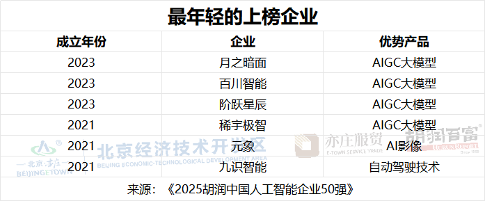 AI企业都普遍年轻,上榜企业平均成立于12年前。成立于2021年以后的上榜企业有6家,分别是月之暗面、百川智能、阶跃星辰、稀宇极智、元象、九识智能。其中,前四者均为大模型企业。
