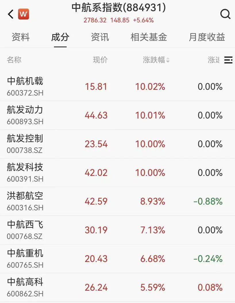 中航系指数高开高走,成份股全线飘红,中航机载、航发动力、航发控制、航发科技涨停,洪都航空涨近9%,中航重机、中航西飞等多股涨幅居前。
