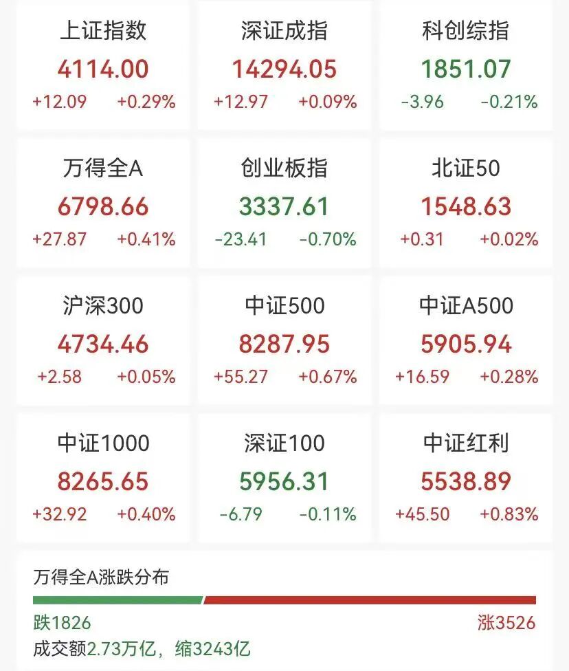 具体来看,A股缩量震荡,截至收盘,沪指涨0.29%,深成指涨0.09%,创业板指跌0.7%。沪深两市成交额2.73万亿元,较上一个交易日缩量3243亿元。全市场超3500只个股上涨,103只个股涨停。