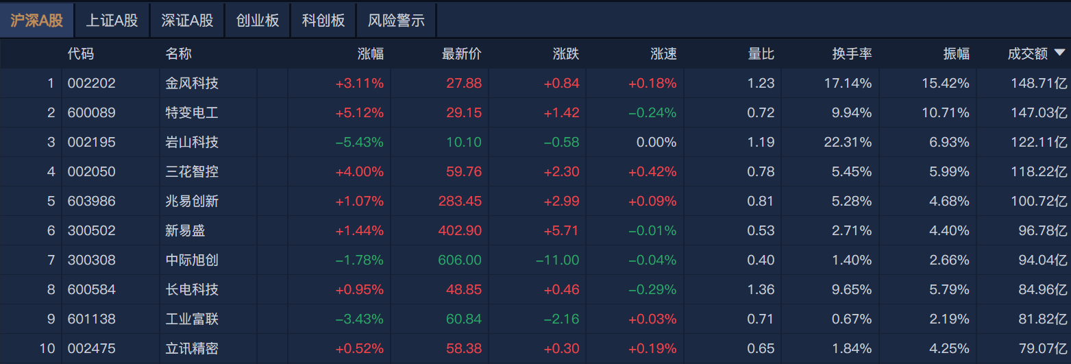 南财金融终端显示,个股方面,金风科技半日成交额超148亿元居首,特变电工、岩山科技、三花智控成交额靠前。