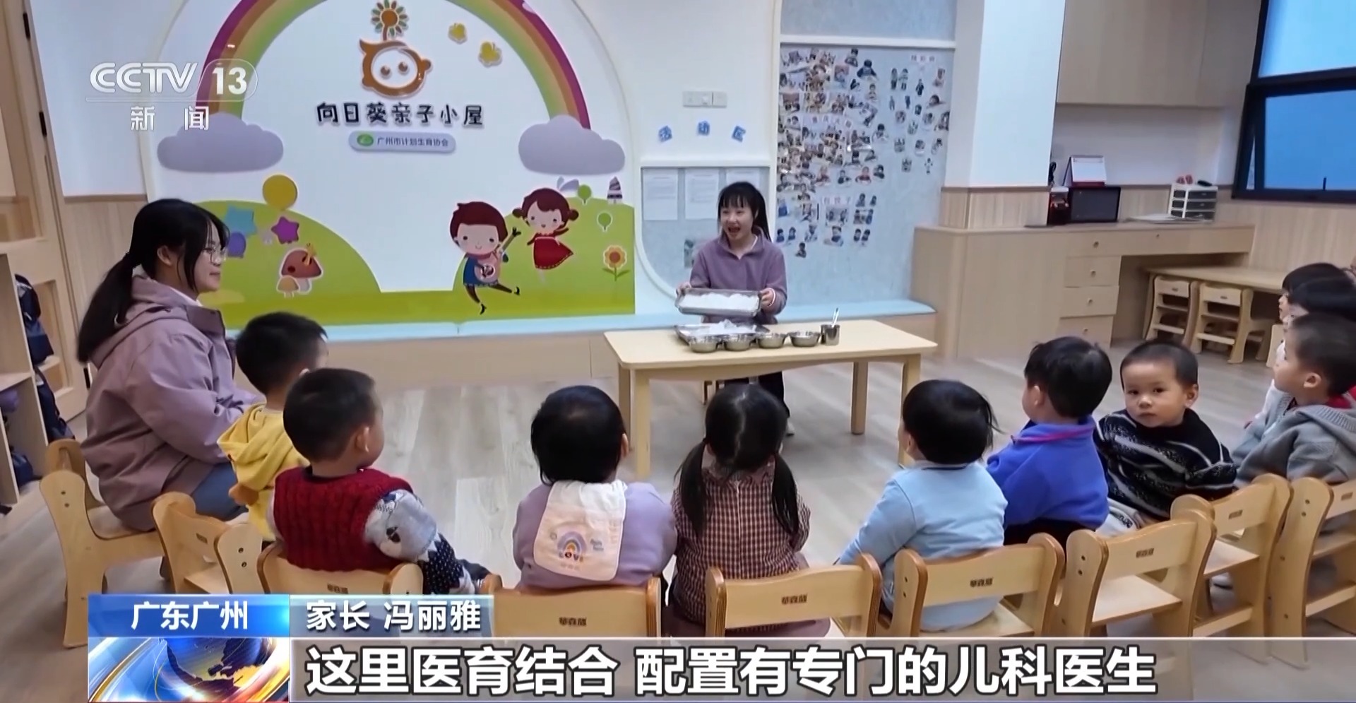 在广州越秀区托育综合服务中心,老师正带着孩子们做游戏。这个中心,为辖区内6个月以上3岁以下的婴幼儿提供托育服务,并根据孩子们入托年龄分成三个班型,每个班配备主教老师和多名保育员,通过各具特色的课程,呵护婴幼儿成长。