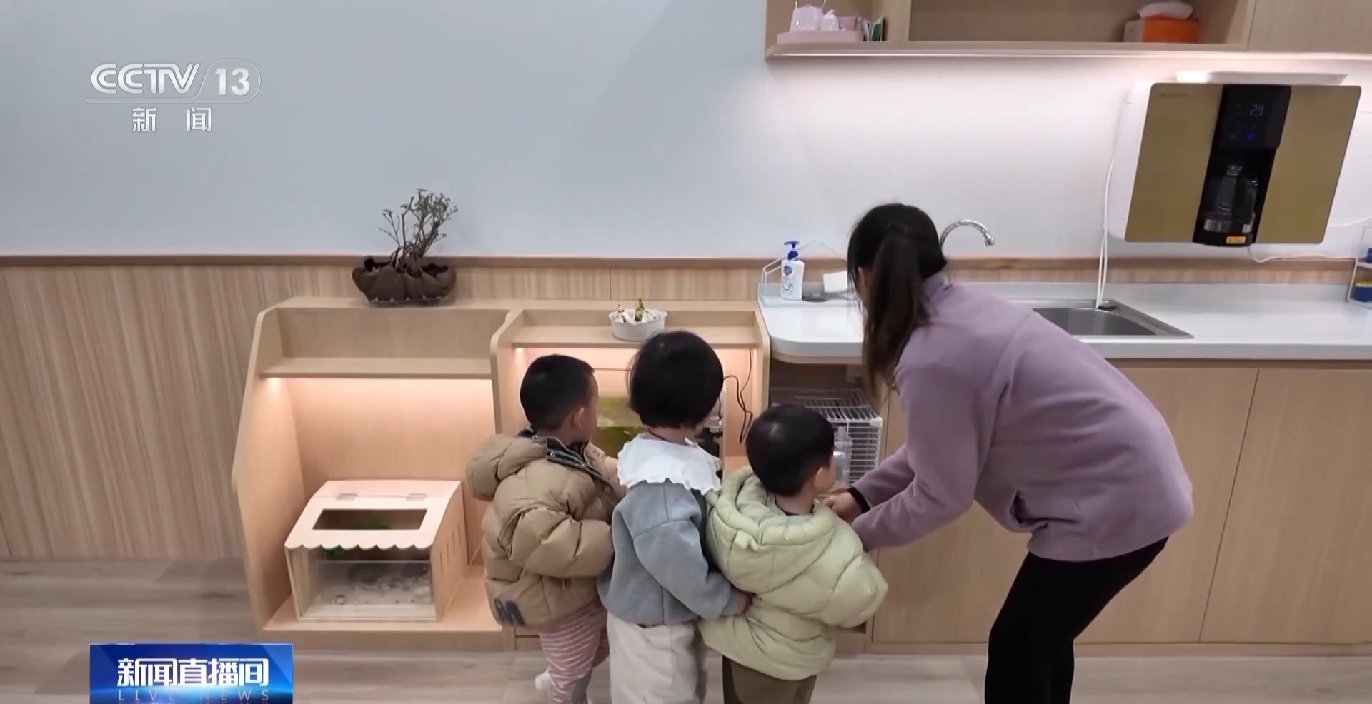 这里的教室,按照婴幼儿身体发育特点进行了改造,桌椅和卫生设备都是迷你型的。走廊里还饲养了小鱼、小乌龟等陪伴孩子们成长。
