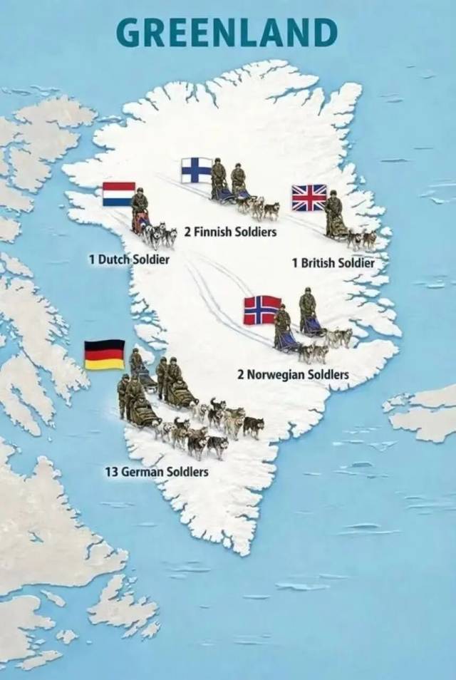 看欧洲媒体的报道,1月16日,德国匆匆忙忙派了13名士兵去演习;第二天,特朗普发出了关税威胁;第三天,即1月18日,德国士兵就紧急撤离了格陵兰岛。