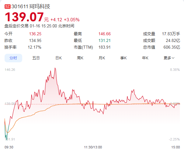1月16日,珂玛科技强势上涨3.05%,收盘价为139.07元,成交额为24.82亿元,总市值攀升至606.35亿元。据统计,自2025年12月10日以来的26个交易日内,珂玛科技股价累计涨幅超过159%,表现非常不错。