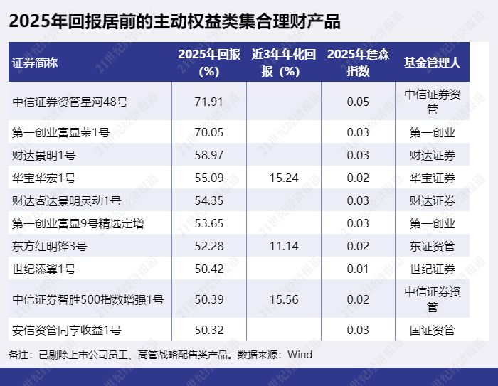 主动权益类产品排名竞争激烈,2025年收益率最高的权益类集合理财产品为“中信证券资管星河48号”,2025年收益率达71.91%。