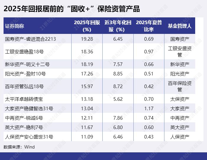 “固收+”保险资管产品中,2025年收益率最高的是“国寿资产-睿进混合2213”,2025年回报为19.28%。“工银安盛稳盈18号”2025年收益率18.36%,排第二。“新华资产-明义十二号”以18.19%排第三。