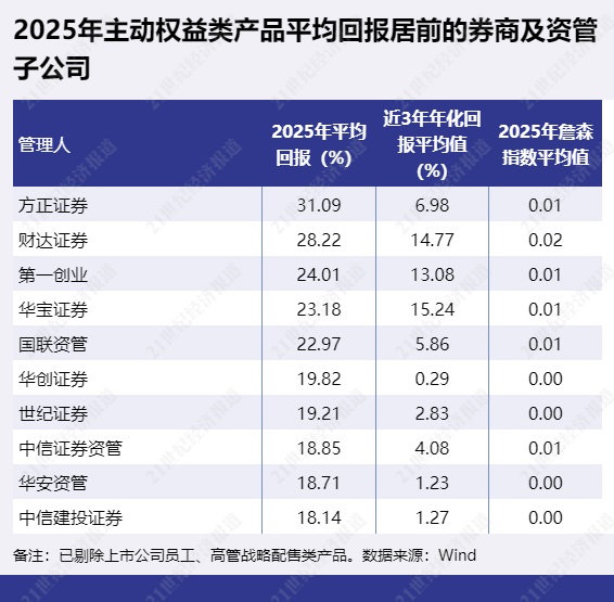 主动权益类产品2025年平均收益率最高的券商及资管子公司为方正证券,2025年平均回报为31.09%,其中有4只产品2025年回报超过40%。财达证券以28.22%的平均回报排第二。