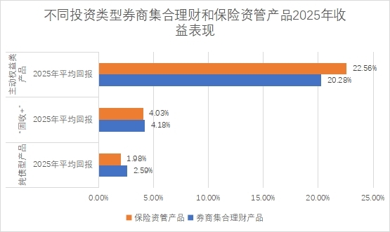 “固收+”由于除了配置债券类资产外,还配置权益类资产、可转债等其他资产,表现明显好于纯债型产品,“固收+”券商集合理财产品2025年平均回报为4.18%,“固收+”保险资管产品2025年平均回报也超过4%,达4.03%。