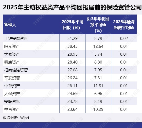 2025年主动权益类产品平均收益率最高的保险资管公司为工银安盛资管,2025年平均回报为51.29%。阳光资产以38.43%排第二,大家资产以28.95%排第三。