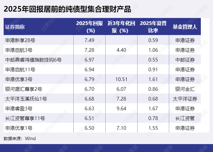 2025年有两只纯债型集合理财产品收益率超过7%。2025年回报排第一的纯债型集合理财产品为“申港新享28号”,2025年回报为7.49%。排第二的是“申港启航3号”,2025年回报为7.28%。