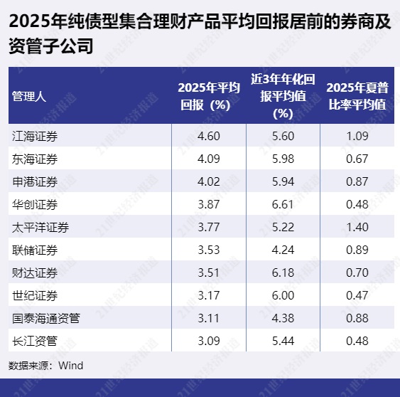 2025年纯债型产品平均回报排名靠前的券商及资管子公司包括江海证券、东海证券、申港证券等,平均回报排名靠后的公司有中泰证券资管、诚通证券、国新证券等。