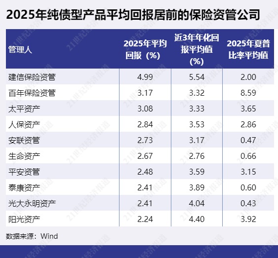 纯债型产品2025年平均回报排第二的是百年保险资管,2025年平均回报为3.17%。太平资产排第三,2025年平均回报为3.08%。