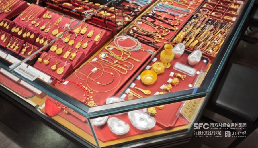 (水贝货架仍以金银条、金银元宝为主,21世纪经济报道记者摄)