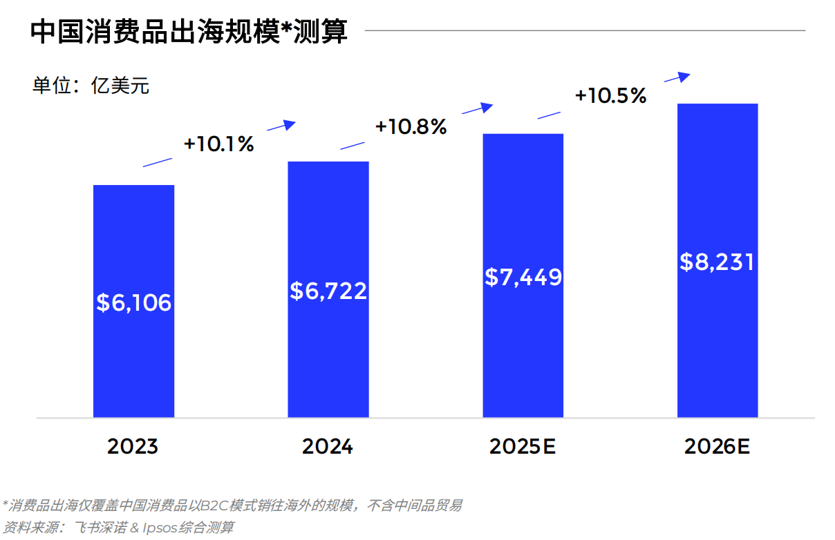 报告指出,中国出海品牌的生存逻辑,已从追逐外部市场红利,转向构建内在的系统性能力。同时,中国消费品出海规模预计将继续保持超 10% 的增长,在 2026 年达到 8231 亿美元。