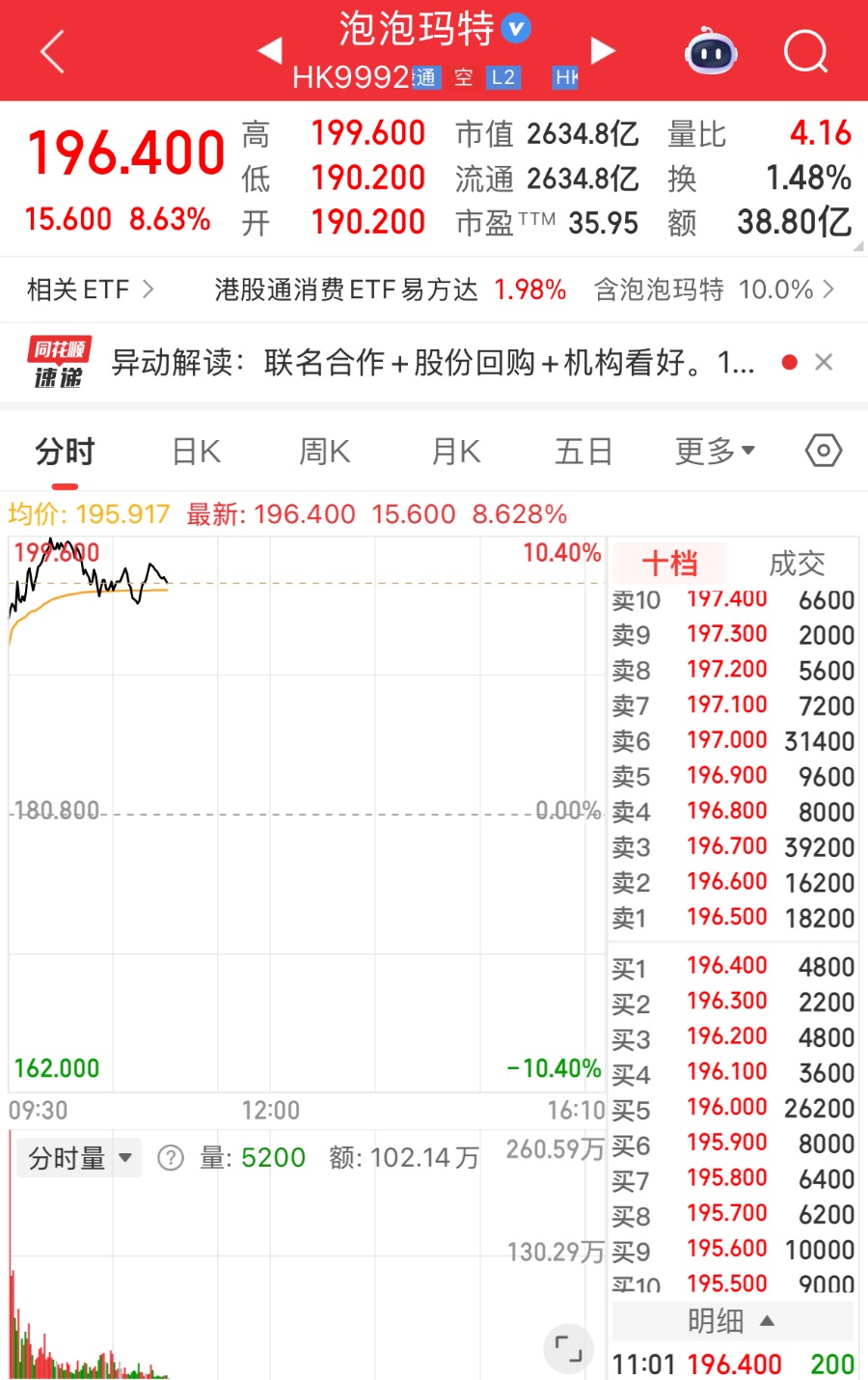 1月20日,泡泡玛特早盘大幅高开超过5%,盘中大涨超10%,报199.6港元/股。