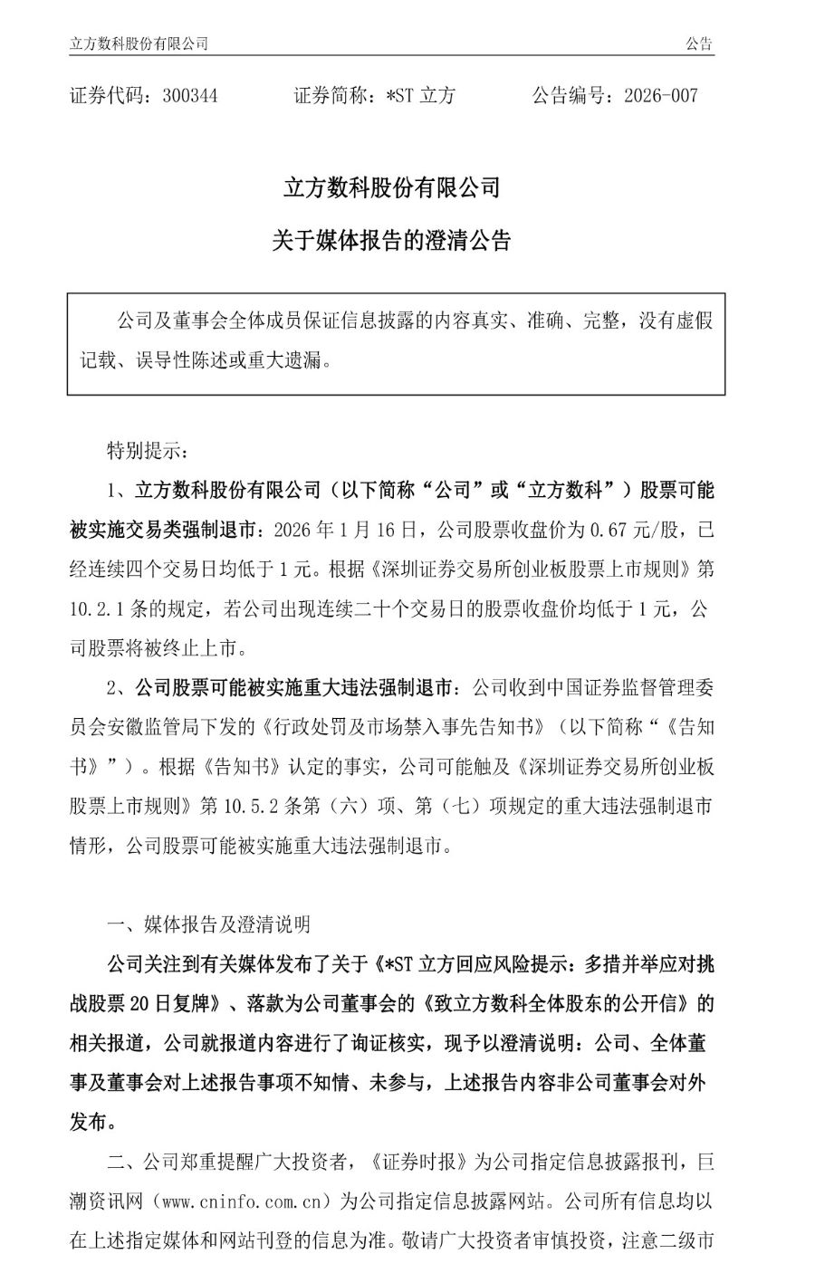 1月20日,21财经《辟谣财知道》注意到,*ST立方(300344)发布澄清公告,公司关注到有关媒体发布了关于《*ST立方回应风险提示:多措并举应对挑战股票20日复牌》、落款为公司董事会的《致立方数科全体股东的公开信》的相关报道,公司就报道内容进行了询证核实,现予以澄清说明:公司、全体董事及董事会对上述报告事项不知情、未参与,上述报告内容非公司董事会对外发布。