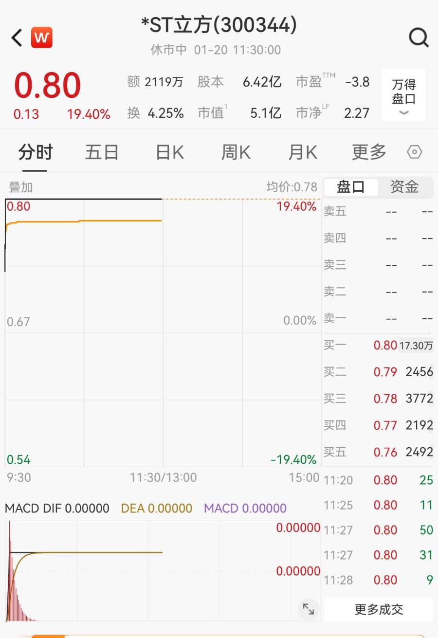1月20日,*ST立方(300344)股票涨停,截至午间收盘,报0.80元/股。