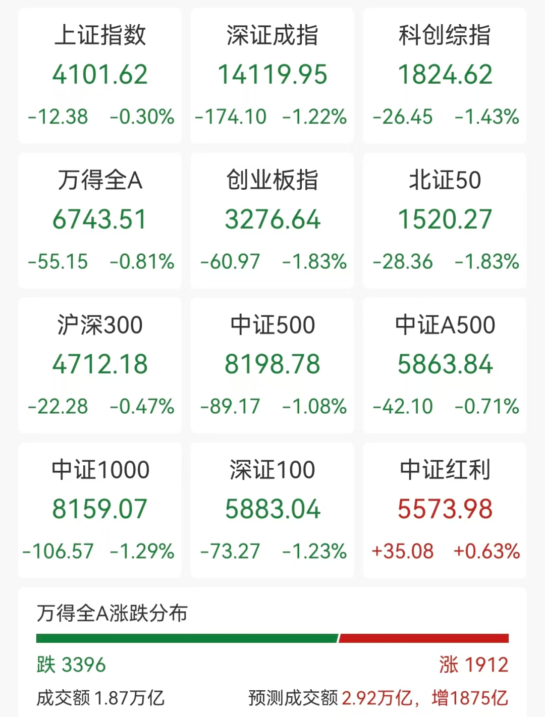 1月20日,A股三大指数盘中跳水,创业板指一度跌超2%,截至上午收盘,跌幅收窄,创业板指跌1.8%,深圳成指跌1.2%,沪指跌0.3%,市场近3400股下跌。